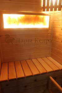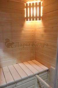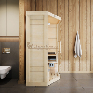 Это специально оборудованная готовая деревянная кабина для сухого и влажного парения. Электропечь нагревает пространство внутри и позволяет сбрызгивать камни водой, слегка увлажняя воздух. Такая процедура позволяет избежать перегрева. Каркас сауны выполнен из массива кедра, снаружи и внутри обшит липовой вагонкой сорта «Экстра» и имеет теплоизоляционный слой. Также двухуровневый полок идёт из кедра для обогащения внутри кабины полезными фитонцидами, а в сочетании с противовирусными свойствами липы сауна становится настоящим источником здоровья.